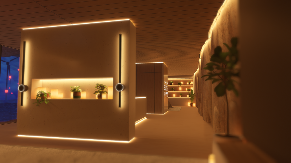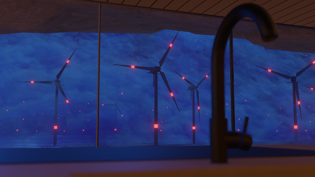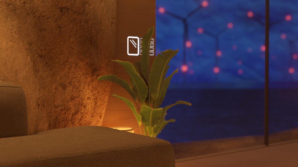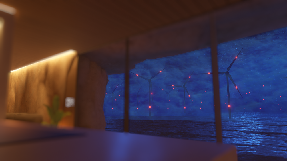 Nimbus is a small world overlooking a sea of windmills (and the actual sea too). Inside you'll find a bed, living room with a video player, kitchen, bath, UI controls for many things in the world, and more!