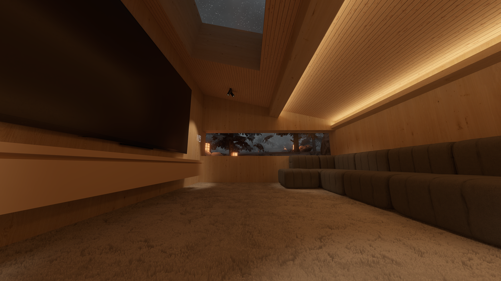 Snowfall (Movie Room) is a Scandinavian-inspired wood house half-buried in a snowy pine forest. There may be a snowstorm outside, but indoors it's nice and warm.